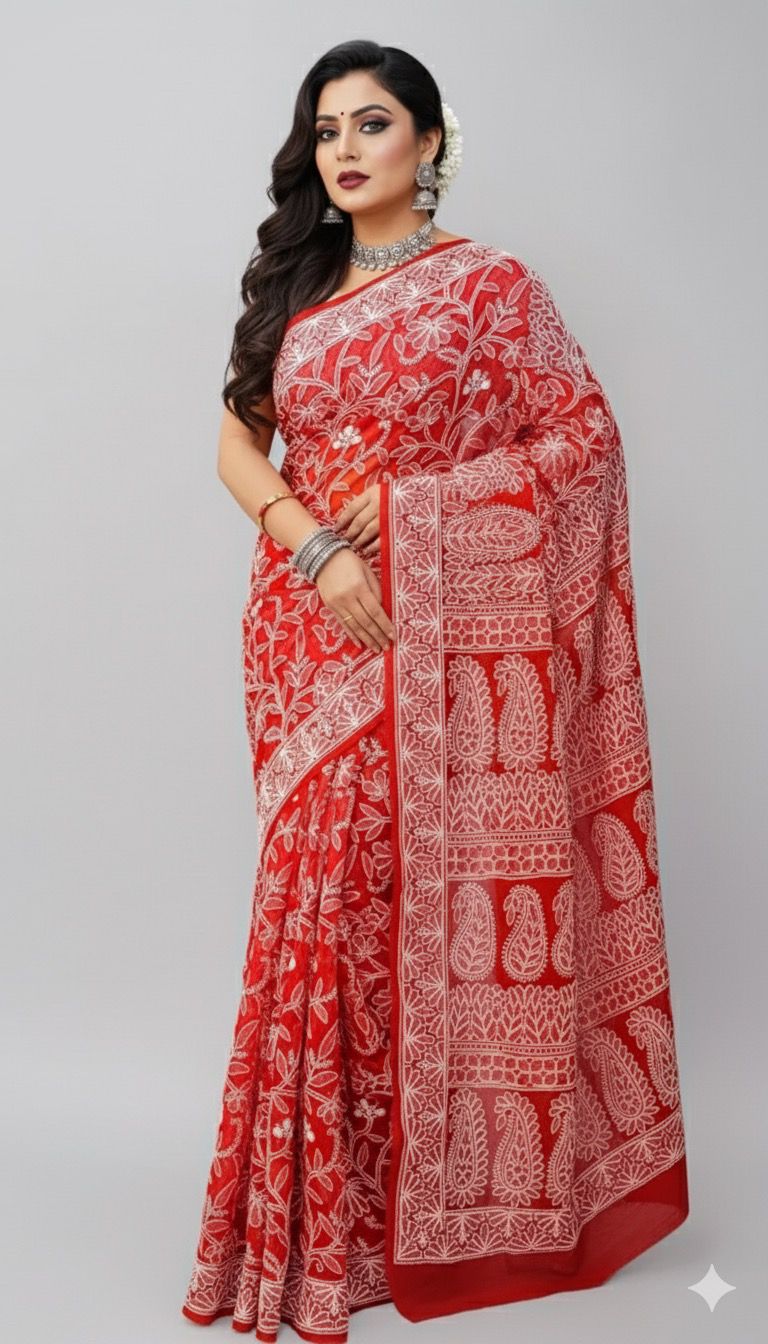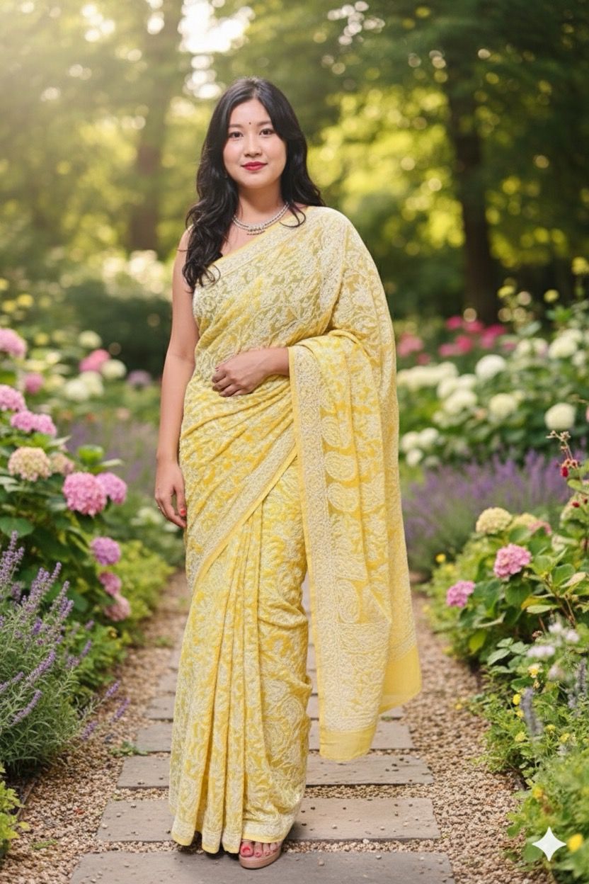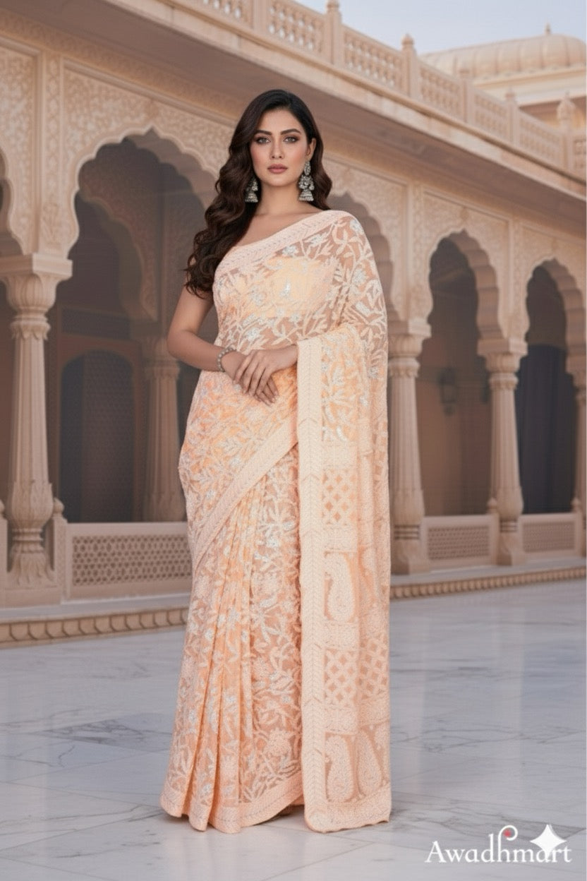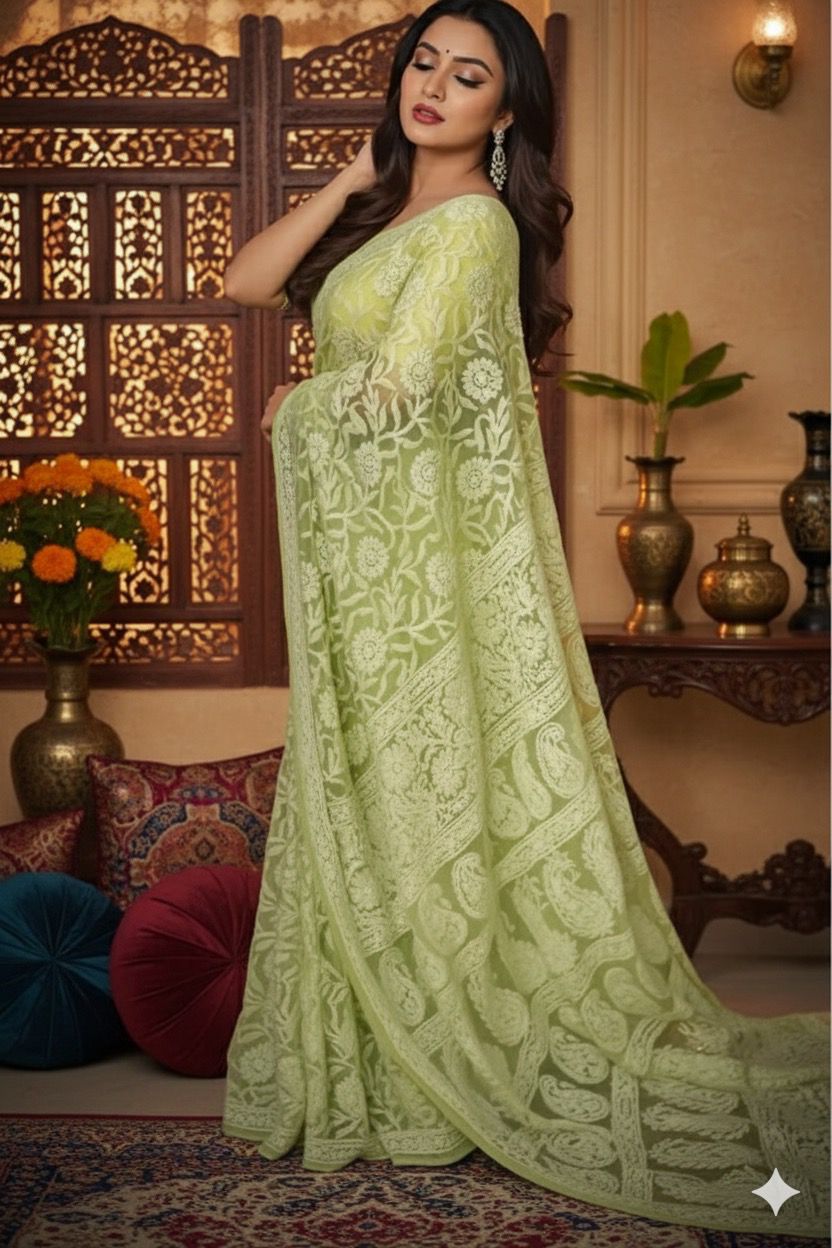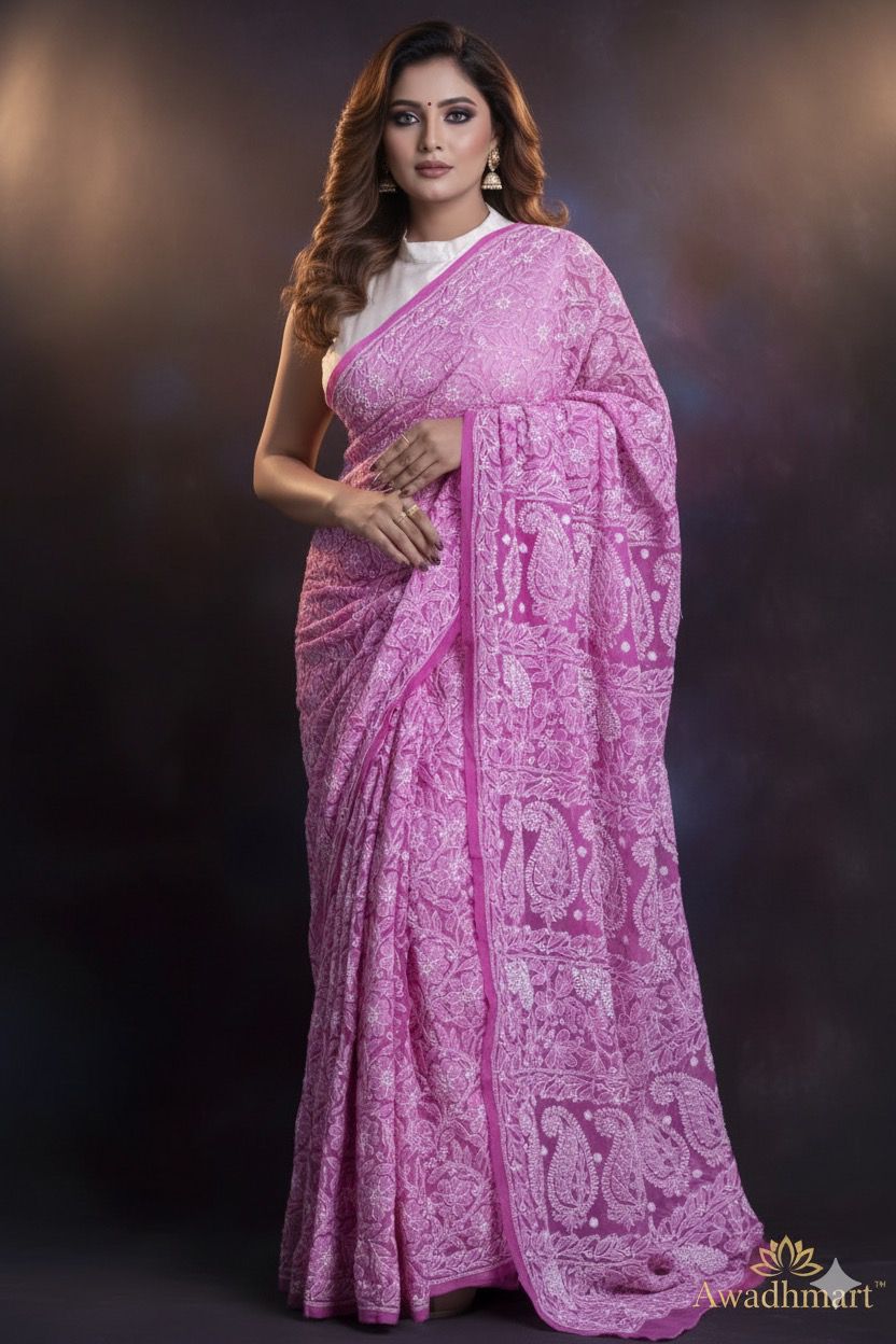 Awadhmart Lucknowi Chikankari hand embroidered full Jaal work Georgette Saree